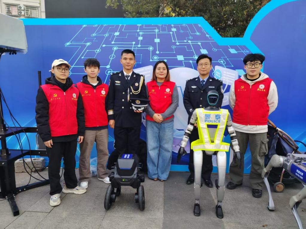 2026年1月10日上午,学生第一党支部书记郑瀚同志带领3名学生党员,携带人形机器人、机器狗以及两轮平衡车科技设备,赴广西河池市金城江区文化广场,与河池市公安局联合开展“人工智能+警务”实践共建活动。市委常委、政法委书记陆祥红,副市长、公安局长梁金昌,市人大常委会副主任陈会邦,市政协副主席韦祖林莅临现场,参观指导本次校警共建工作。