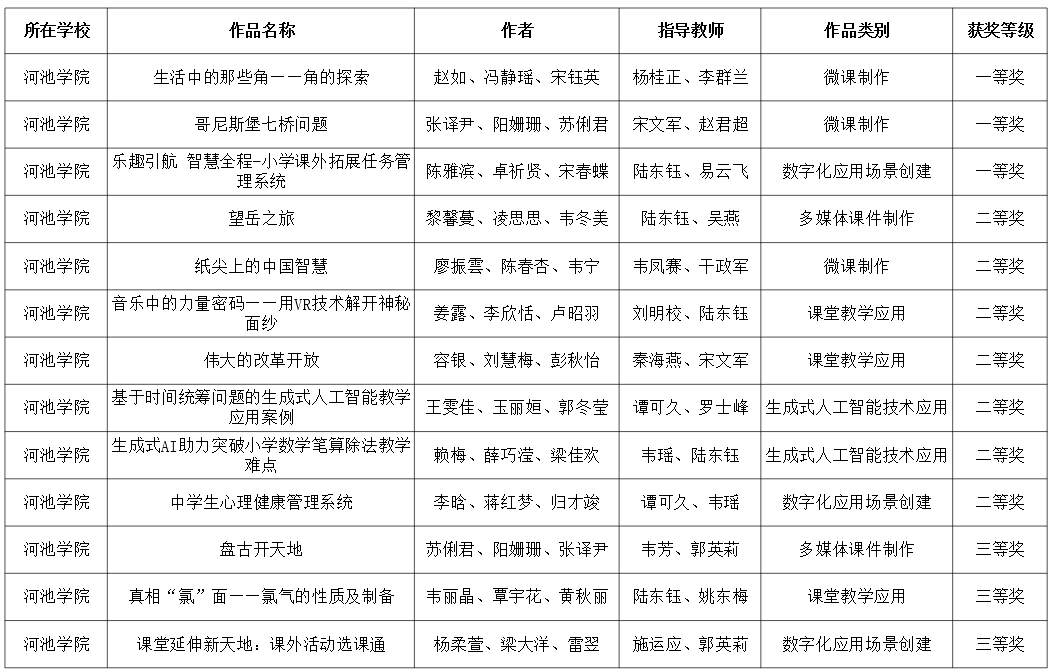 近日,广西壮族自治区教育厅公布 2025 年全区师范生信息化教学应用大赛获奖名单,我校选送的 15 个作品在多媒体课件制作、微课制作、课堂教学应用、生成式人工智能技术应用、数字化场景创建 5 个赛项中,共斩获 13 个奖项,其中一等奖 3 项、二等奖 7 项、三等奖 3 项。