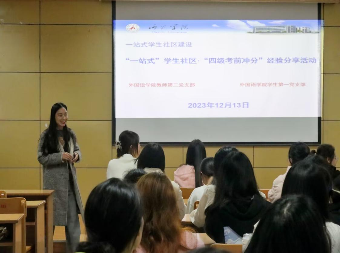 随着2023年12月英语四级考试的临近,为加强“一站式”学生社区建设,帮助同学们能在考前获得更好的成绩,12月13日晚,由外国语学院(国际教育学院)教师党支部举办的“四级考前冲刺”经验分享会在大学生活动中心315教室成功举办。由外国语学院赵乐诗同学和宫佳雪同学担任主持人,外国语学院大三学生廖启月和韩映老师担任主讲人,向大家分享一些考前冲刺的经验。来自不同学院的60余名同学参加活动。