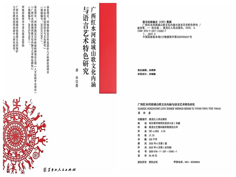 近日,我院蒋华教授学术专著《广西红水河流域山歌文化内涵与语言艺术特色研究》由黑龙江人民出版社正式出版。该书是国内首部全面系统探究红水河流域山歌文化内涵与语言艺术特色的学术力作。