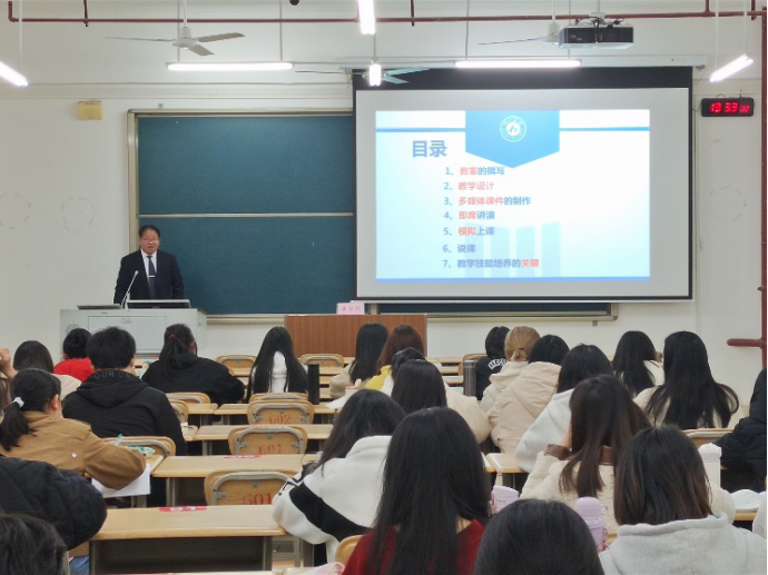 潘宝剑在讲座开始前,首先说明将从教案的撰写、教学设计、多媒体的制作、即席讲演、模拟上课、说课与教学技能培养的关键这七个方面来开展此次讲座。在讲座进行中,潘宝剑重点指出一个好老师应具备良好的临场讲演能力和制作课件与教案的能力,并告诉在场的同学们,要积极适应并掌握新课程标准,以此培养自己的综合素质与实践能力,为未来从事教师行业奠定基础。