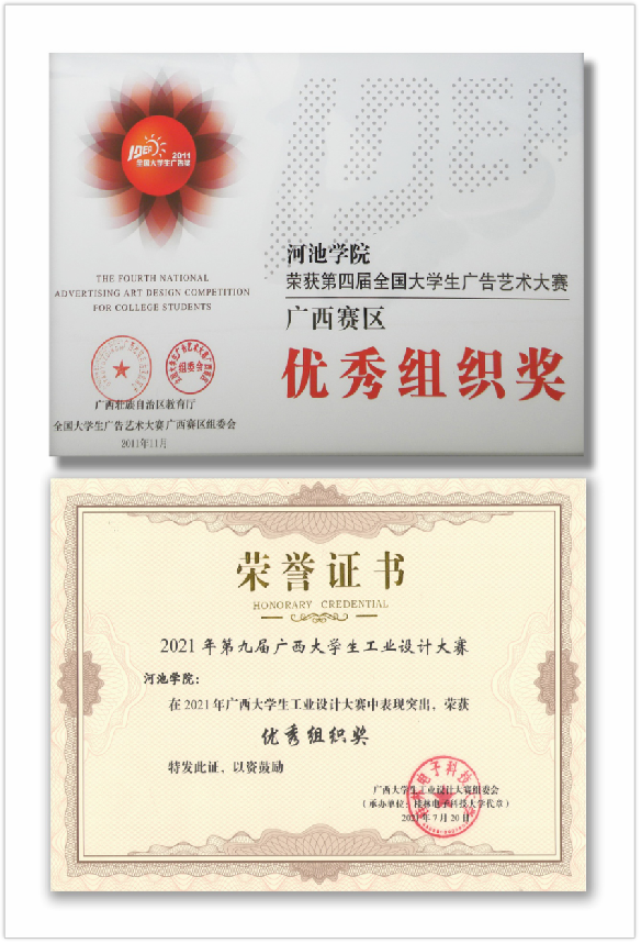 9.2018年7月,刘芝伶、陈思羽同学在全国大学生工业设计大赛广西赛区中分别获得一等奖;黎梅娇、武志豪、谢志平、罗兆余等同学分别荣获二等奖。刘芝伶同学在全国大学生工业设计大赛中荣获入围奖。