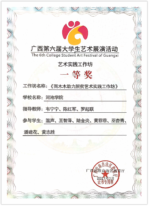 1.2014年12月,梁保满同学在广西第四届大学生艺术展演活动中荣获一等奖;石莲英、廖红、滕云、唐文正、曾慧云等同学荣分别获二等奖。