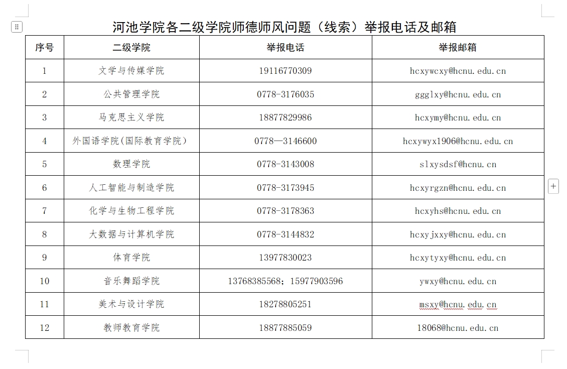 学校师德师风监督举报电话:0778-3144681;举报邮箱:sdsf@hcnu.edu.cn。各二级学院师德师风监督举报电话和举报邮箱见下表。投诉举报请提供具体线索材料,投诉举报电话受理时间为工作日上班时段。