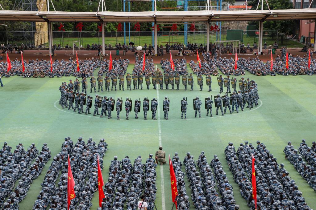 大会军训成果展示环节,2025级军训团以方阵形式展开成果展演,各学院学生组成的队伍迈着矫健整齐的步伐、喊着铿锵有力的口号走过主席台,展现14天军训的扎实成效;教官指挥下的匕首操、盾牌术表演更是动作干脆利落、场面振奋人心,充分呈现出新生们昂扬的精神风貌与过硬的军事素养。