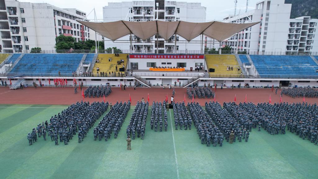 最后,韦文广作军训工作总结讲话。他代表学校党委、行政与军训工作领导小组,向承训的宜州区人民武装部及全体教官致以衷心感谢,向全程陪伴的带队老师表示亲切问候,向圆满完成军训任务的全体新生及获奖集体、个人表示热烈祝贺。他指出,国无防不立,民无兵不安。接受军事训练,既是《兵役法》《国防教育法》赋予学校的职责和同学们应当履行的光荣义务,也是磨练意志、强健体魄的有效途径。汇报表演不仅让我们清晰地看到了军训的累累硕果:从散漫到整齐的队列,从陌生到默契的协作,从娇气到坚韧的蜕变;更让我们欣喜地见证了班级建设的初步成效——一个个凝聚着向心力的集体,在此刻焕发出蓬勃的活力。而这一切正是学校立德树人、稳步发展最坚实的根基,也为同学们未来的大学成长之路,埋下了充满力量的种子。同时,他对新生提出四点希望:一是用纪律铸就自律,以规矩涵养担当底色。二是用协作汇聚合力,以团结书写时代答卷。三是用集体成就个体,以实干融入发展。四是用青春对接时代,以奋斗实现价值。(作者:韦凉妹、李欣 拍摄:融媒体中心新闻部 校对:罗冬雨 审核:杨玉珠)