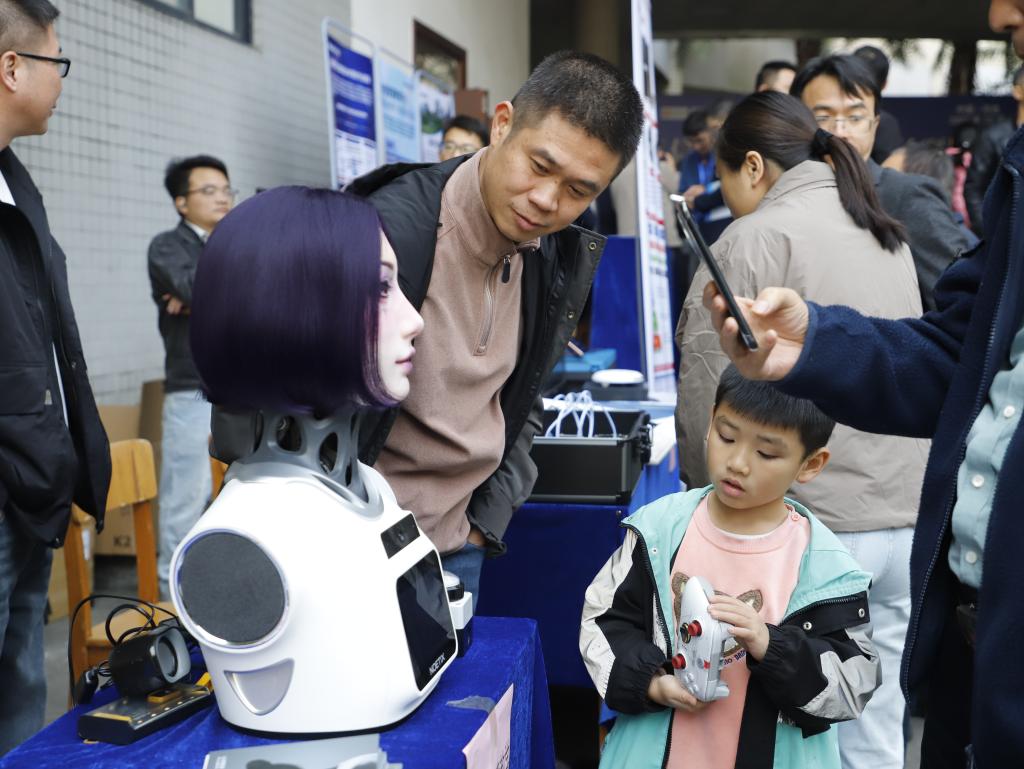 参会者与仿生机器人互动。