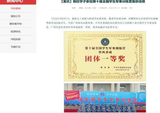 我校学子代表广西参加第十届全国学生军事训练营喜获作风养成团体一等奖。