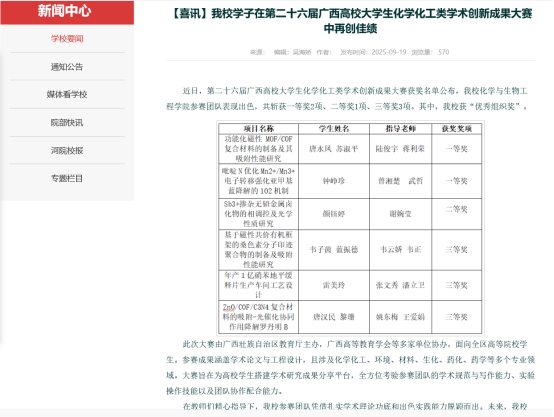 我校学子在第二十六届广西高校大学生化学化工类学术创新成果大赛中斩获一等奖。