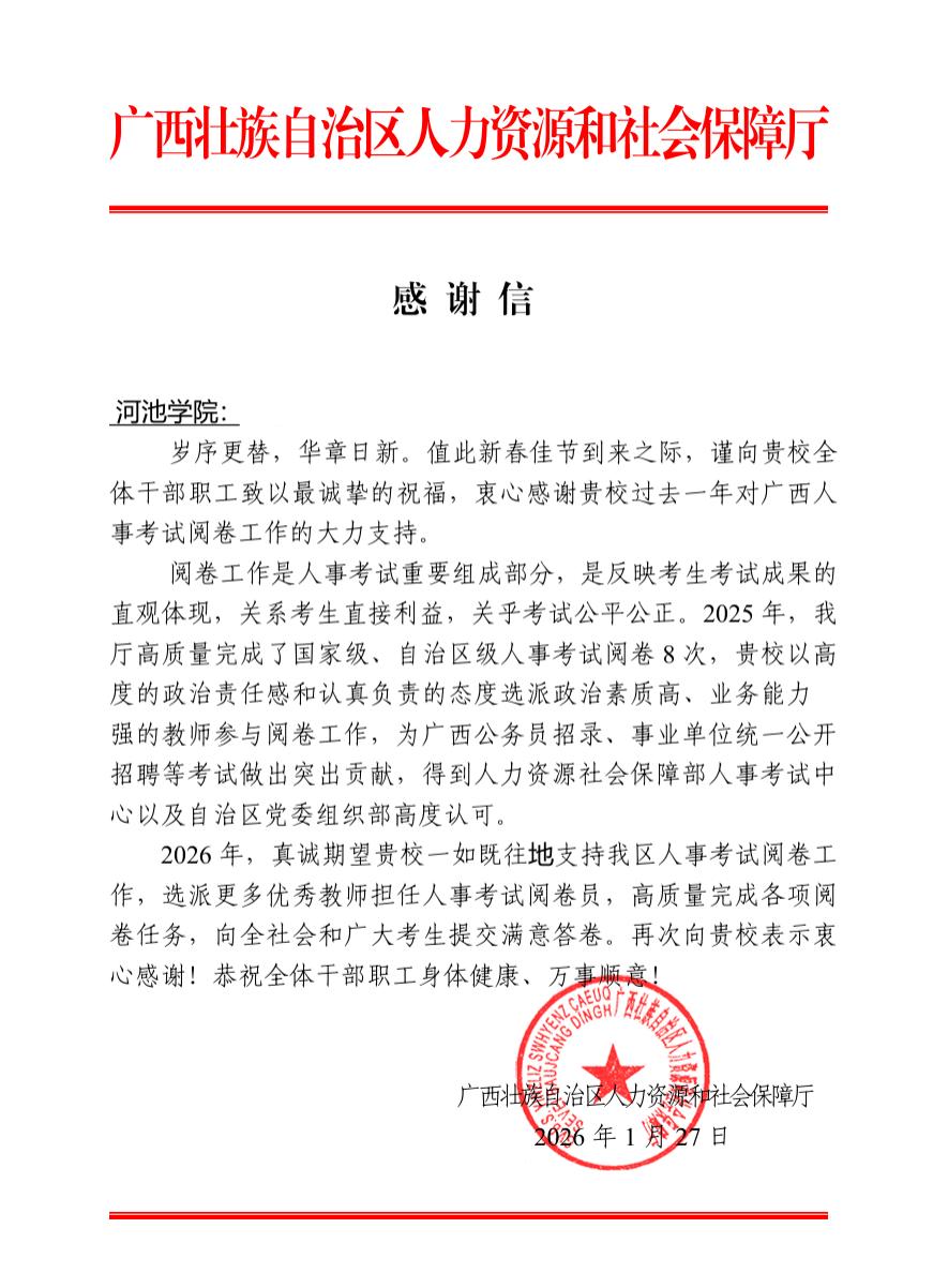 近日,我校收到广西壮族自治区人力资源和社会保障厅发来的感谢信,对我校在2025年广西人事考试阅卷工作中给予的大力支持和突出贡献表示高度认可与衷心感谢。