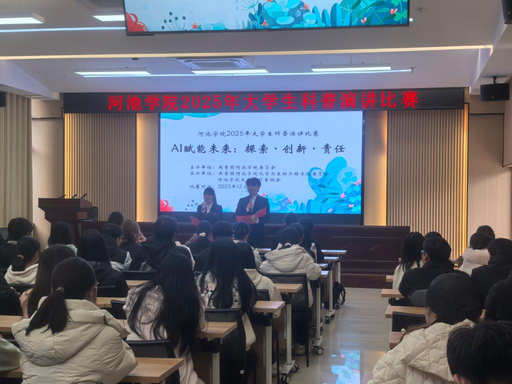 12月10日,我校在格致楼102会议室举行2025年大学生科普演讲比赛。来自13个二级学院的14名选手参加比赛,各二级学院学生代表观看比赛。