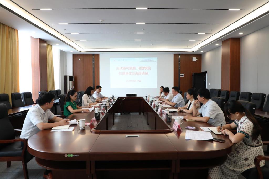 6月22日上午,河池市气象局党组成员、纪检组长罗雅等一行5人到我校开展校合作交流座谈会。科学技术管理处处长李晓东、学生工作部、教务处等相关职能部门领导参加座谈。