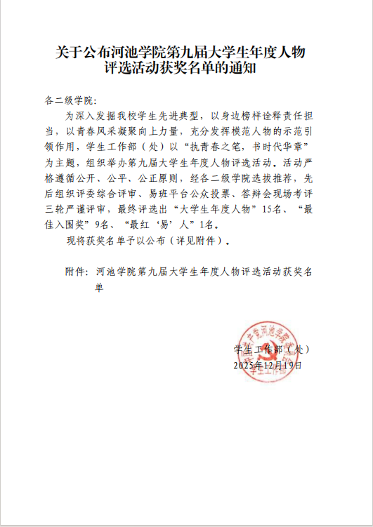 近日,学校学生工作部(处)公布了第九届大学生年度人物评选活动获奖名单。本次评选以“执青春之笔,书时代华章”为主题,旨在发掘学生先进典型,发挥榜样引领作用。经严格评审,我院学子表现突出,喜获多项荣誉:
