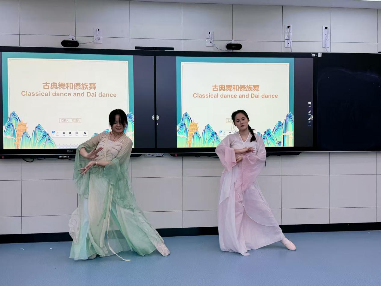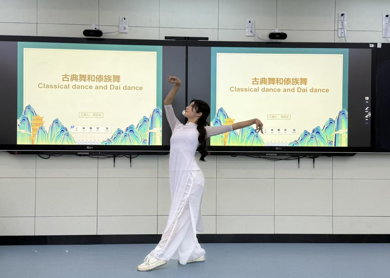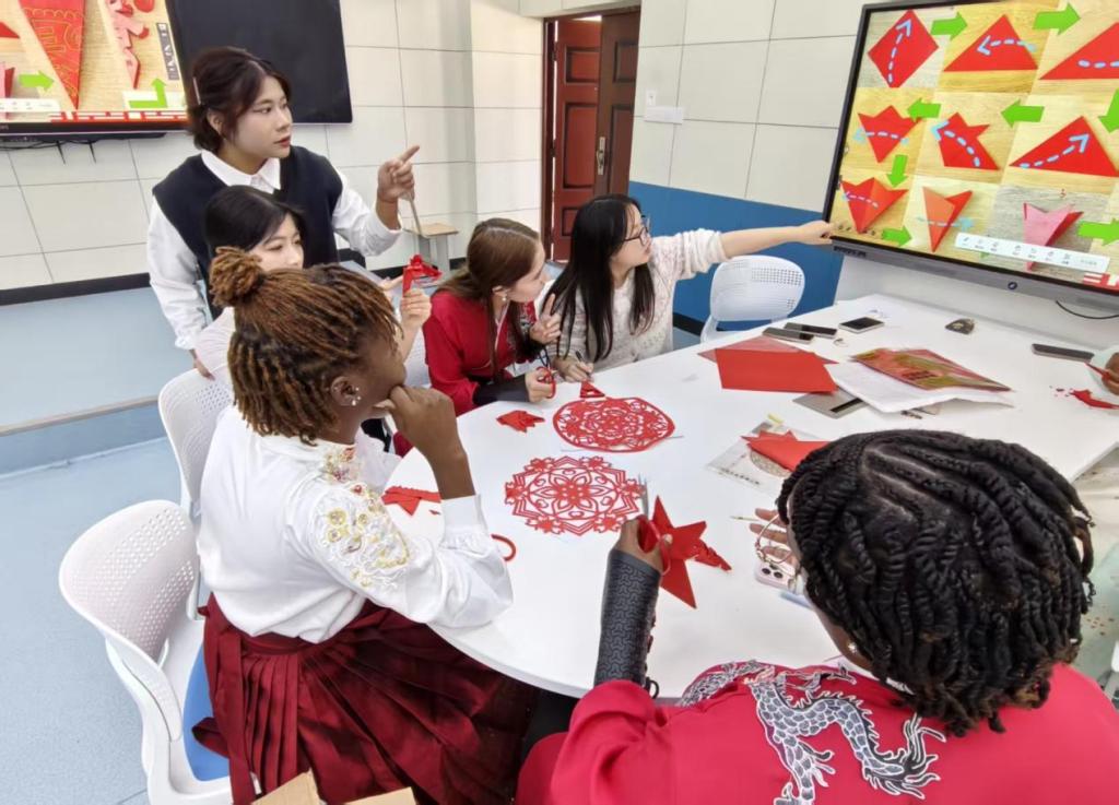 The second session, on November 16, focused on “Dance, Music, and Paper Art, Experiencing China.” TCSOL students provided English explanations throughout, introducing paper-cutting, the hulusi (a traditional Chinese instrument), and Chinese dance, and guiding international students in hands-on cultural experiences. Li Meiling and Liang Jinying detailed the intangible cultural heritage of paper-cutting, leading participants in creating their own works; Yang Sunna shared knowledge about the hulusi and performed the classic piece “Colorful Clouds Over the South,” showcasing the charm of traditional Chinese music; Ou Yuyan and two other students explained the cultural significance of classical and Dai ethnic dances, combining performance and interactive teaching to help international students appreciate Chinese aesthetics through dance.