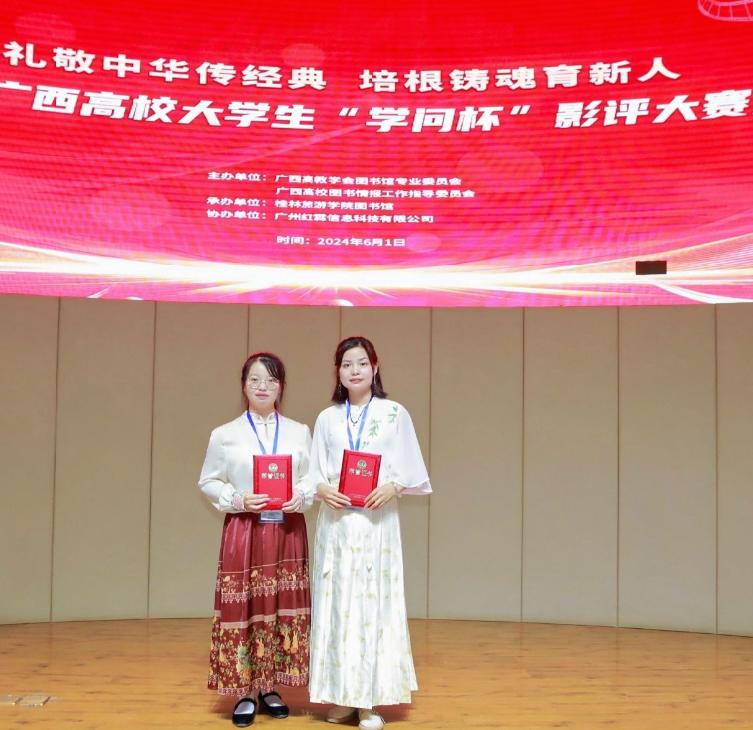 本次大赛由广西高教学会图书馆专业委员会、广西本科高校图书情报工作指导委员会主办,面向全区在校大学生开展。大赛从3月20日启动,采用了“各高校馆组织初赛+现场决赛”的形式,分本科院校组和高职高专组,全区62所高校7657名学生参与。我校图书馆设置了初赛奖项,并在校园书店播放比赛指定影片10部。活动共收到影评73篇,选送10篇参加复评,最终莫丽娟、陈灿梅同学成功入围决赛并在现场决赛中获奖。