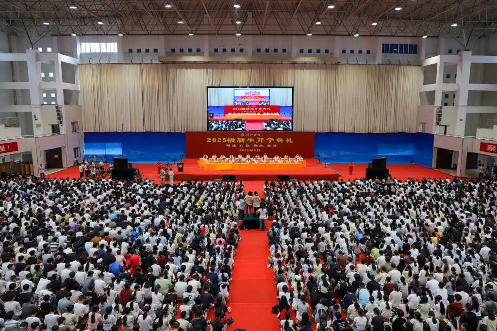 龙江向东秋月欢,会仙迎客八方来。9月16日,我校在体育馆举行2025级新生开学典礼,近4700名新生正式以“河院人”的身份,开启了新的征程。学校党委书记甘毅出席典礼,校长马少健出席典礼并讲话。我校优秀校友、第十一届茅盾文学奖获得者东西,优秀校友、深圳市雨滴科技有限公司总经理吴玉勇现场为学生寄语。优秀校友、广西文联副主席、第十三届全国少数民族文学创作骏马奖获得者凡一平通过视频为新生作寄语。全体校领导、党委常委,各二级学院、各部门主要领导出席典礼。