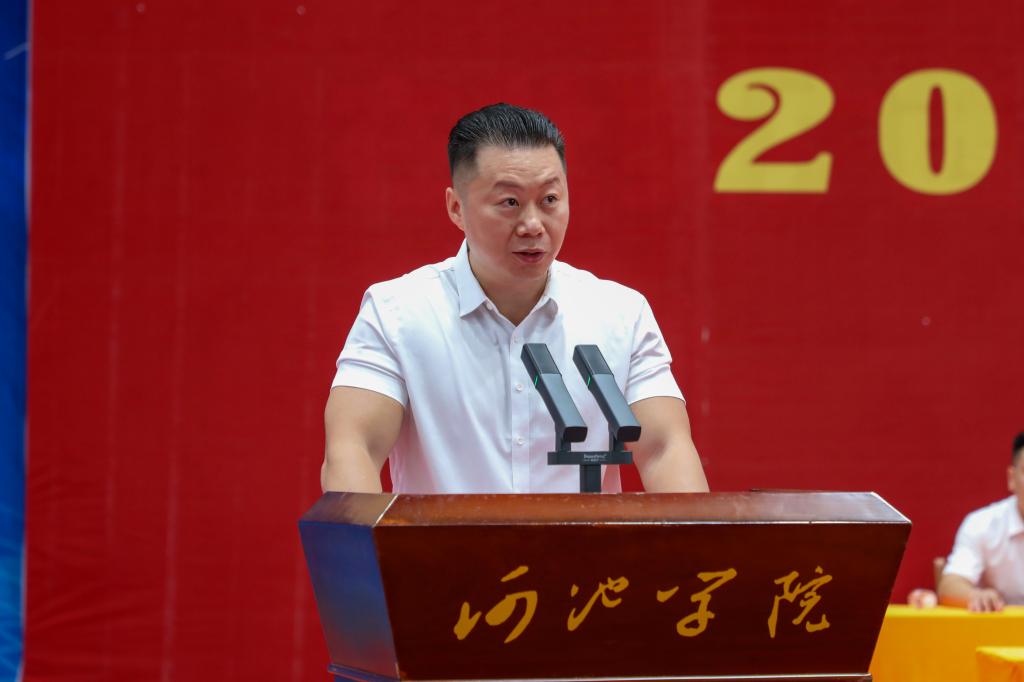 马少健在致辞中介绍了河池市和学校的基本情况。他指出,正是河池山美水美、人杰地灵和独特资源,孕育和壮大了我们河池学院。70多年来,河池学院代代师生薪火相传、弦歌不辍,用七十余载书写了独特的光辉奋斗史,铸就了“作家的摇篮”“桂西北中小学教师的摇篮”“地方民族文艺体育冠军的摇篮”三张闪亮名片。马少健勉励新生们“不忘来时路,融入时代潮,做不甘平庸的河院新人”。他说,要尽快理解适应大学阶段学习生活方式,成功实现个人的升级转段,尽快把自己融入新环境,对自己进行再发现、再考验、再提升;要认真学好思政课程,厚植家国情怀,为未来站稳人民立场,听党话、跟党走,以及个人事业发展和家庭幸福行稳致远打下扎实的思想和理论基础。要加强专业理论学习和实践锻炼,夯实职业基础,争取未来靠专业敲门、靠能力闯关、靠精神持续、靠品格上进;要培养兴趣特长,锻造健康身心,在专业课程学习之外,积极利用学校资源,加强锻炼、挖掘潜能、培养兴趣;要积极拥抱AI,融入时代潮流,先做“追随者”,再做“驾驭者”,在不断淬炼中提升自己。