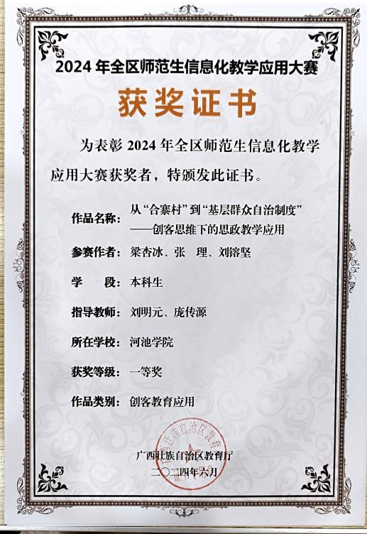 (一)思政课建设迈上新台阶。党对思政课建设的领导全面加强,学校社会主义办学方向更加鲜明,思政课教师乐教善教、潜心育人的信心底气更足,大学生“四个自信”明显增强、精神面貌奋发昂扬,思政课发展环境和整体生态发生全局性、根本性转变。马院积极推进思政课教学改革创新,取得一批成果。2021年江洪明教授等主持完成的《高校思政课“十时五度五点”教学模式探索与创新》获广西高等教育自治区级教学成果二等奖。2022年罗昌勤教授等负责的“毛泽东思想和中国特色社会主义理论体系概论”获得自治区级一流本科课程。4名教师入选全区思想政治教育卓越人才支持计划。多位中青年教师获得广西思政课“精彩一课”“广西青年教师教学竞赛”等省部级教学奖。2024年马院提出的“12363”铸魂育人模式,得到区教育厅思政课教学巡察组的好评。在区教育厅开展的“习近平新时代中国特色社会主义思想大学习领航计划2023年系列主题活动”中,获得大学生讲思政课公开课展示活动三等奖3项,获得大学生微电影展示活动二等奖1项、三等奖1项。在教育厅举办的“我心中的思政课”——2024年广西高校大学生微电影展示活动中,获二等奖1项、三等奖2项。思政课教学资源建设取得新成效。譬如:牙远波教授主持的教育部课题组建立了“中国近现代史纲要”资源库。大中小学思政课一体化建设和“大思政课”建设呈现新亮点。2024年4月推动成立河池市大中小学思政课一体化建设指导委员会,马院3名教师入选专家委员会委员。《学习宣传贯彻党的二十大精神,大力弘扬中国共产党人精神谱系》在《广西日报》2023年1月10日第11版发表,中国网转载;《精教深研真学实干——河池学院马克思主义学院新时代劳动教育综述》在《广西日报》2023年2月6日第7版发表,新浪网转载;《坚持学、思、用贯通 扎实推进“大思政课”建设》,在《广西日报》2023年7月4日第8版发表。在2024年全区高校“大思政课”教学改革优秀工作案例征集活动中,获得二等奖1项。