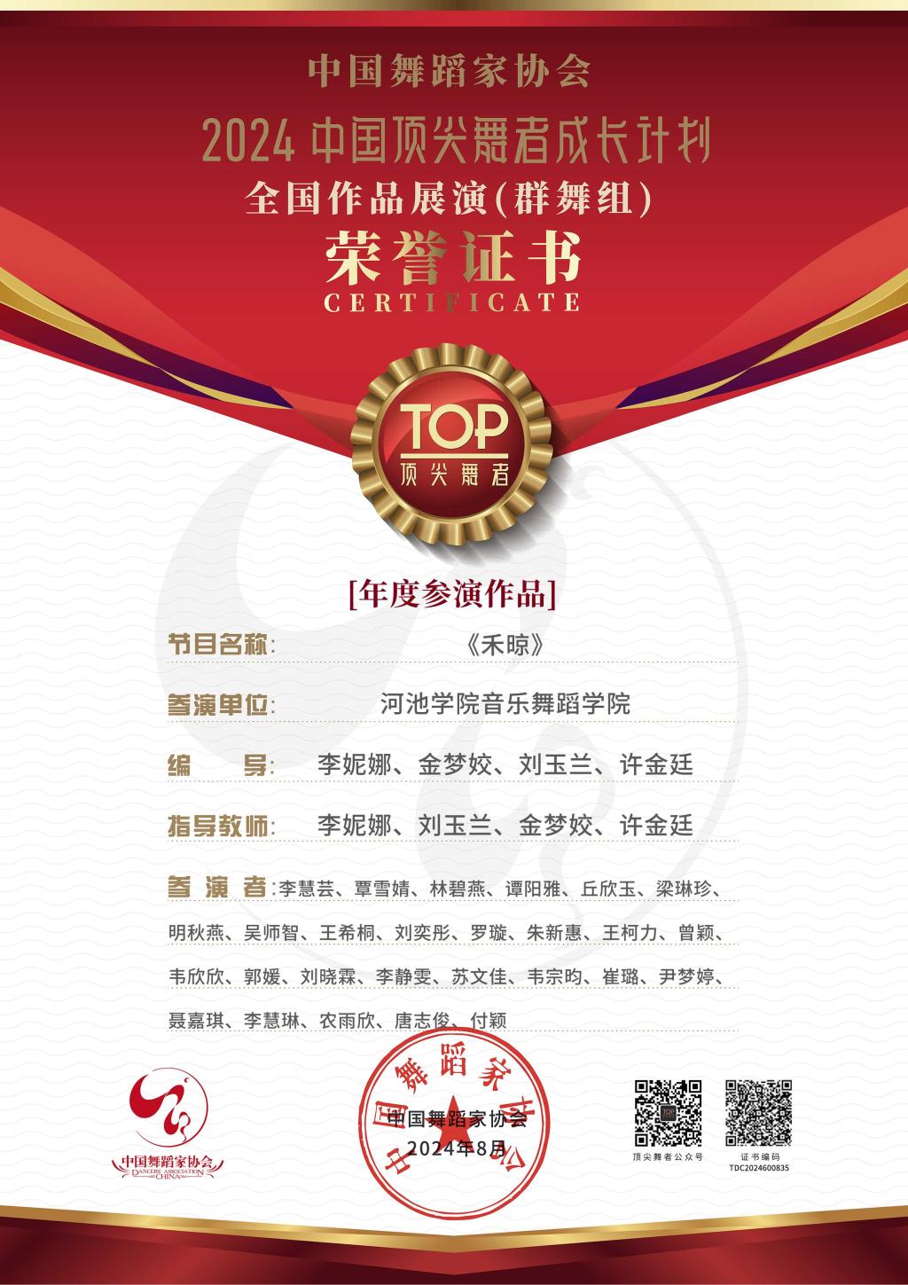 2024年河池学院舞蹈《禾晾》获中国顶尖舞者成长计划全国作品展演群舞组证书