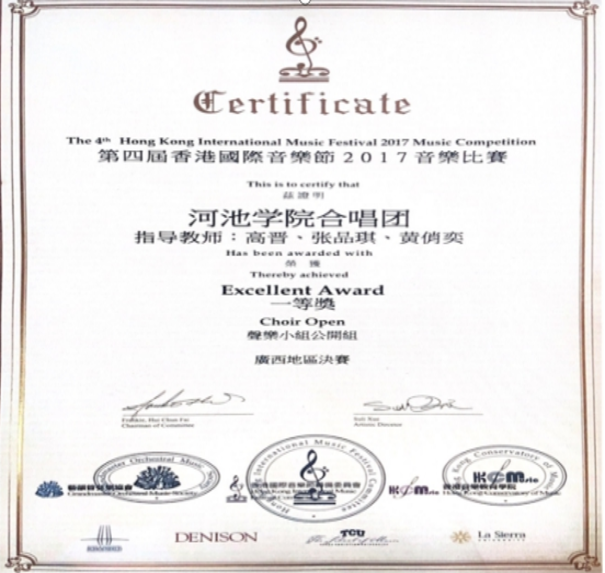 2017年河池学院合唱团获第四届香港国际音乐节一等奖